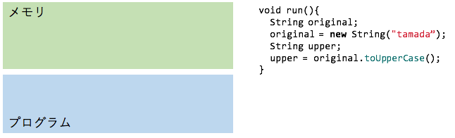 このプログラムは,String型変数であるoriginal に対して,toUpper を呼び出し, その返り値をupper というString型変数に代入しています. Javaのあらゆるメソッドはこのように,何らかのものに対して呼び出します.