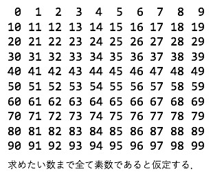 素数を求めるには,エラトステネスのふるいを使うと良いでしょう. 次の画像は,0以上100未満の素数を求める時のエラトステネスのふるいのアルゴリズムを表したものです. 順に最後まで繰り返して残った値が素数です. 画像をクリックすると順に素数ではない数値が消えてきます.参考にしてください.