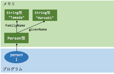 フィールドの参照・代入もメソッド呼び出しと同じように,どの実体のフィールドなのかを 意識して指定してください.Person型のフィールドgivenNameには,上記のperson.givenName = name1 のように,Person型の変数を介してしかアクセスできません.