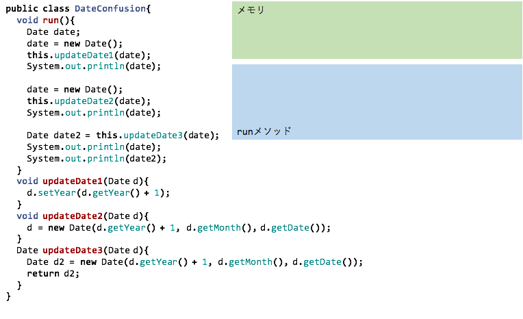 次のプログラムを考えてみましょう.updateDate1,updateDate2,updateDate3の3つのメソッドそれぞれで