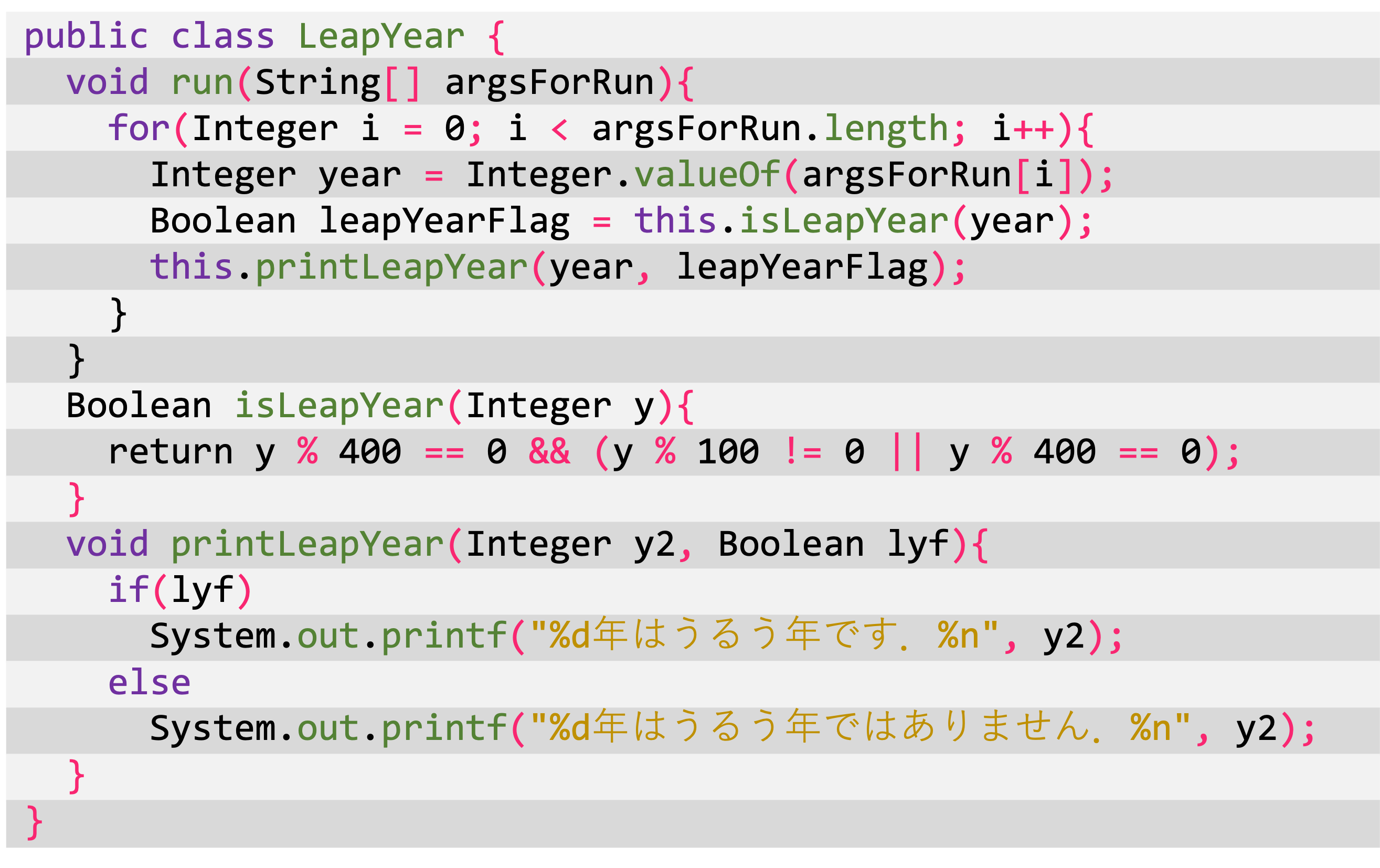 this.printLeapYear(year, leapYearFlag)でprintLeapYearメソッドをそれぞれ呼び出しています.